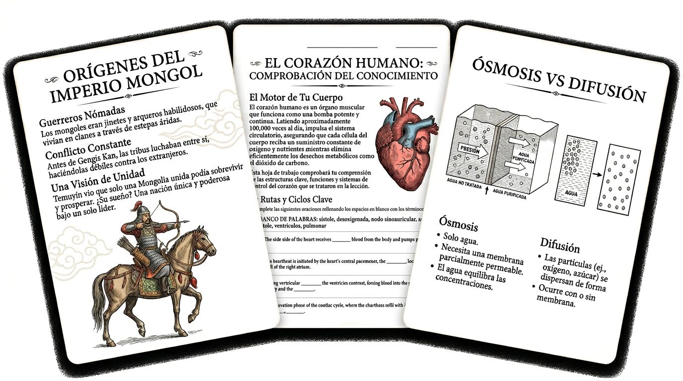 Genera presentaciones completas, fichas didácticas y secuencias de aprendizaje alineadas al currículo en menos de un minuto.